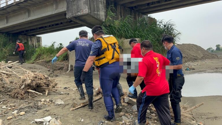 消防隊員尋獲溺斃男子遺體合力抬上溪邊。…