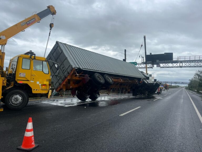 國道1號貨櫃車被強風吹翻。翻攝畫面 【…