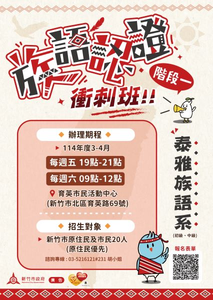▲竹市府3/7開辦泰雅族語系初、中級認證考…
