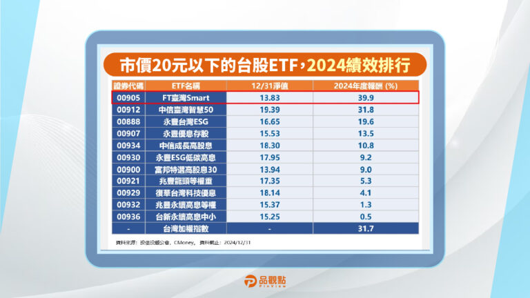 2024年低價、績效冠軍FT臺灣Smart ETF(00…