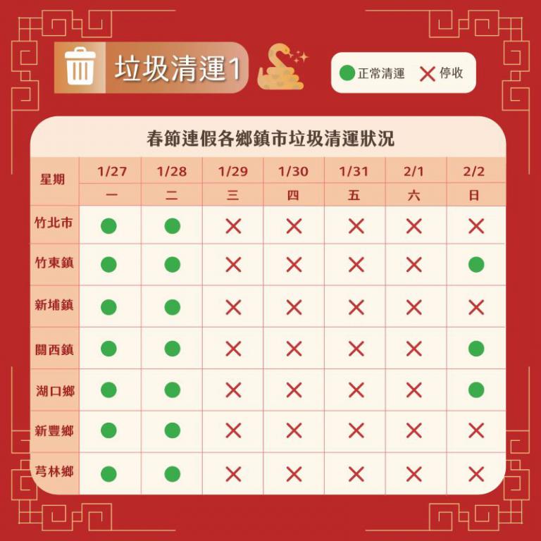 ▲春節假期新竹縣各鄉鎮市垃圾清運情形。(…