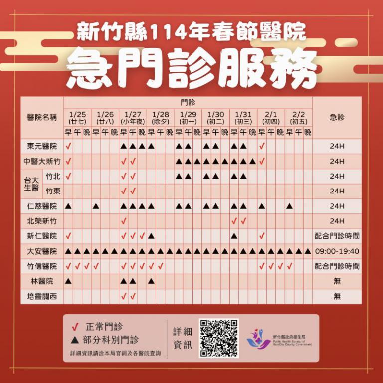 ▲新竹縣政府彙整春節連假期間各家醫院急門…