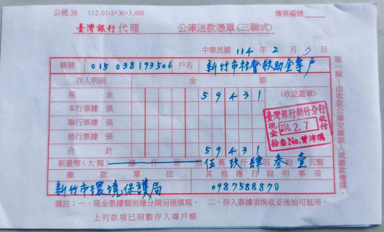 ▲竹市清潔隊紅包將全數轉贈至「新竹市社會…