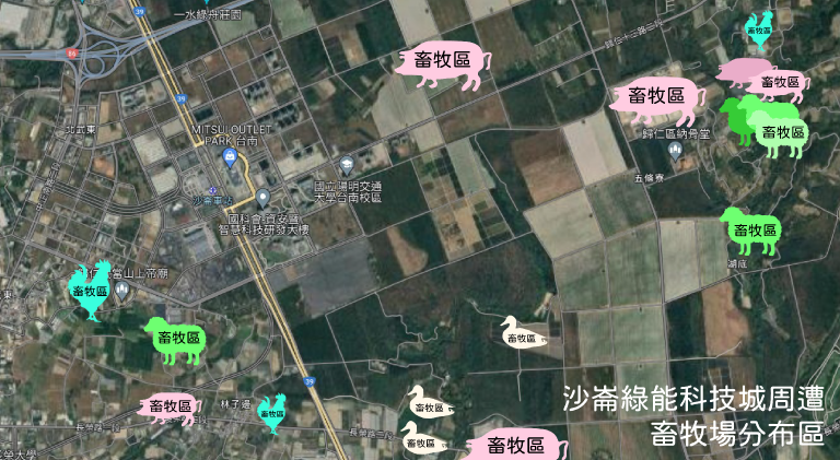 ▲大型養殖畜牧場至少就5家幾乎包圍著沙崙…