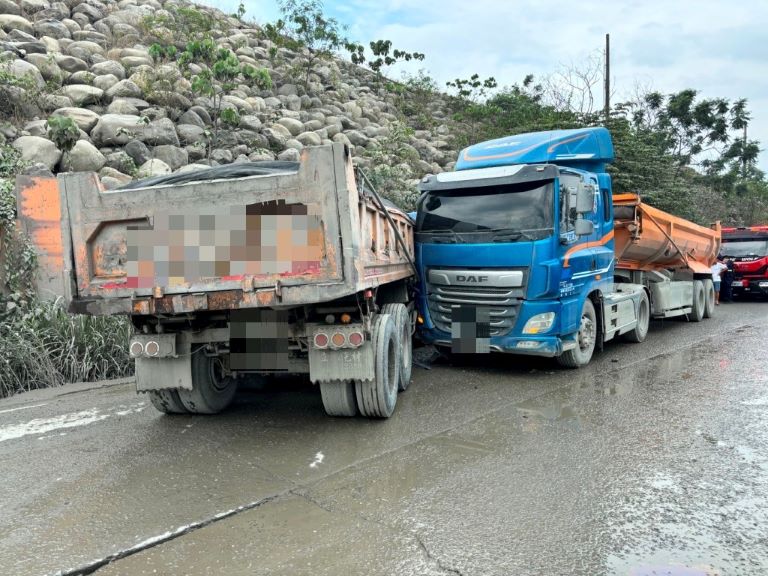 ▲里港鄉防汛道路曳引車閃避撞擊路旁圍牆。…
