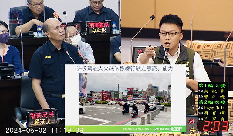 ▲台南市議員朱正軒今日於議會質詢時呼籲強…