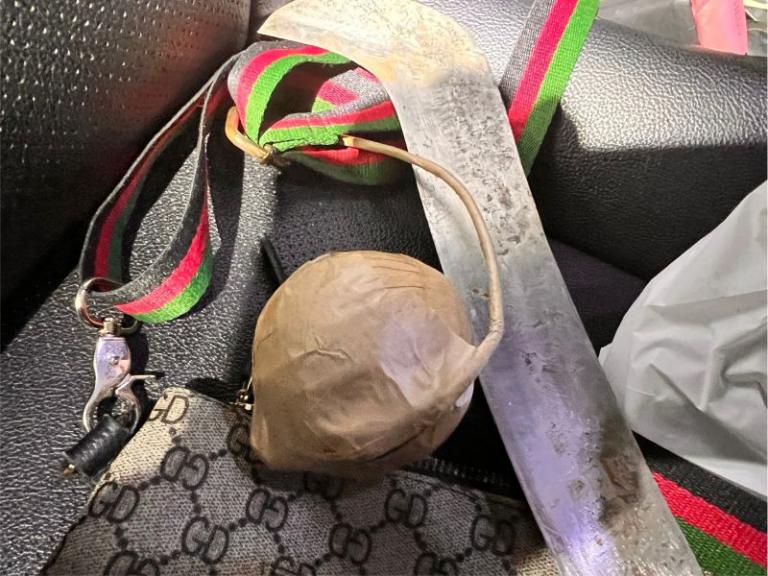 ▲員警查獲疑似爆裂物的土黃色圓球體。(圖/…