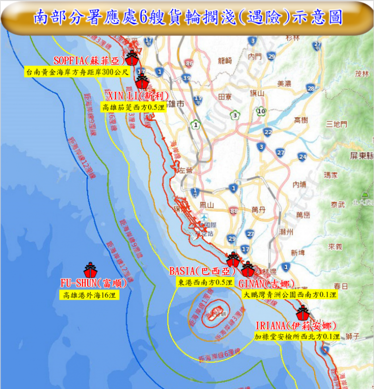 ▲南部分署應處6艘貨輪擱淺(遇險)示意圖。(…