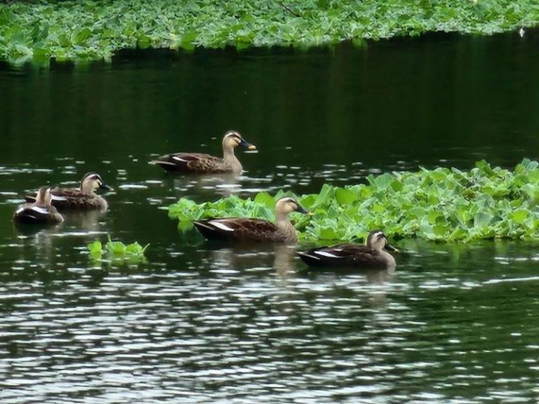 ▲新竹市溪埔子人工濕地出沒的花嘴鴨群。(…