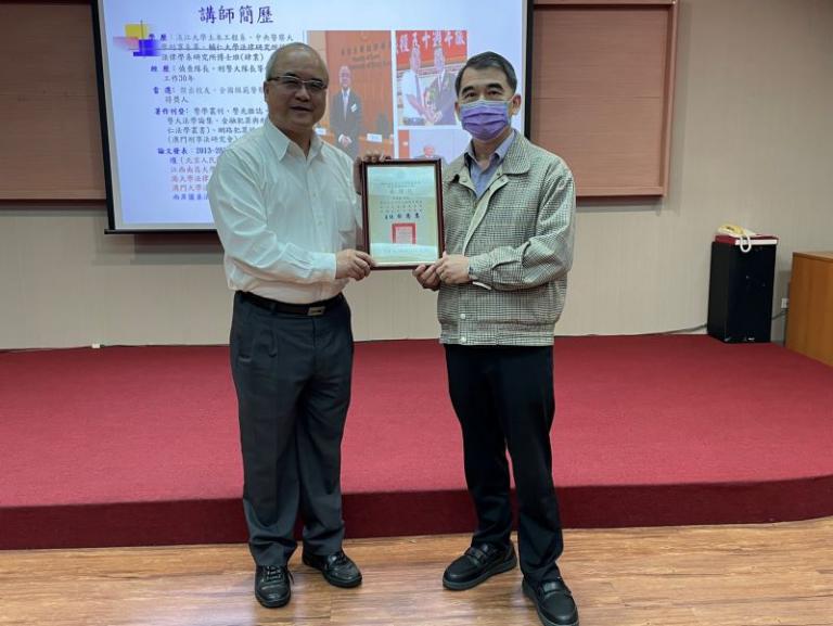 ▲副主任劉慶元(右)頒贈感謝狀予洪俊義講師…