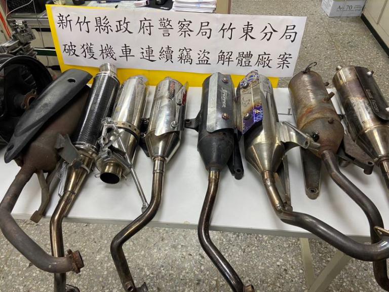 ▲竹東警方查扣排氣管、引擎等贓物。 (圖/…