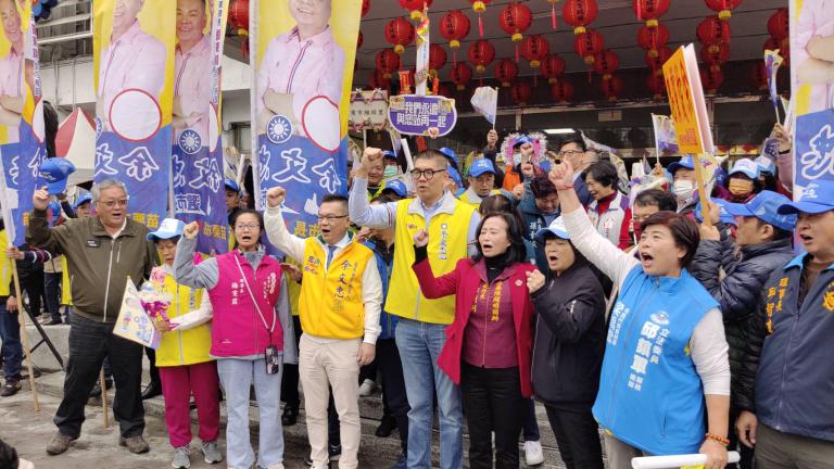 ▲苗栗市長候選人余文忠7日在媽媽、太太、…