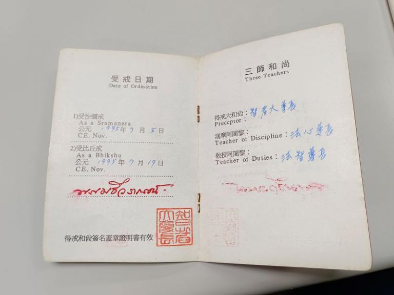 ▲寺廟受戒證書證明老先生法名是「智者大尊…