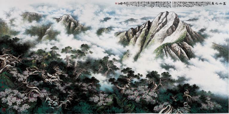 ▲藉由國畫畫法,展現玉山主峰磅礡景緻(玉…