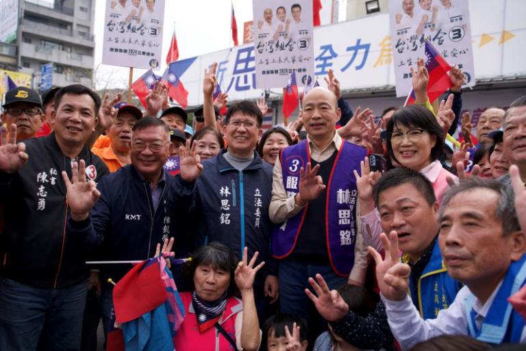 ▲韓國瑜抵達林思銘競選總部時,受到總部志…