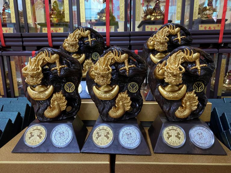 ▲南投紫南宮龍年錢母亮相。(圖/記者何秀…