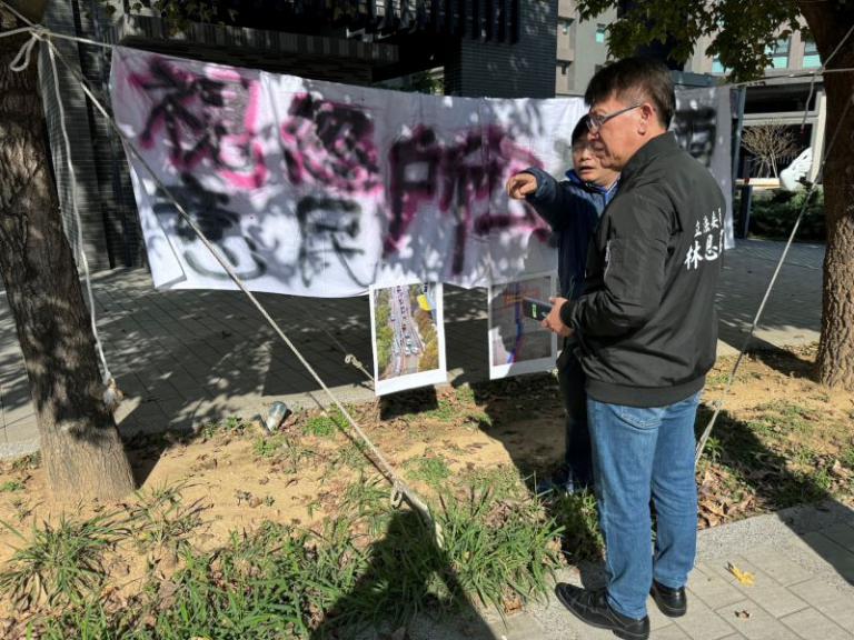 ▲社區住戶拉白布條抗議光明路拓寬工程。 …