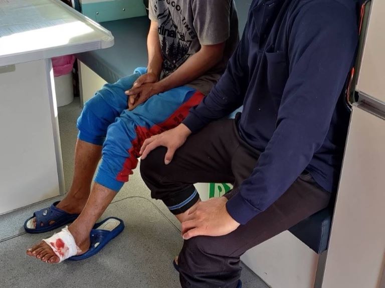 ▲漁船上印尼籍漁工作業時左腳不慎被魟魚刺…