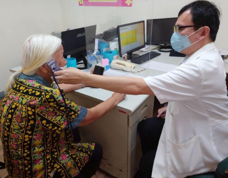 ▲醫師以音聲擴聽器與長輩溝通問診。(圖/記…