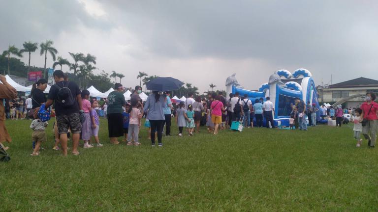 ▲縣議員簡千翔提供大型氣墊城堡,一開場就…