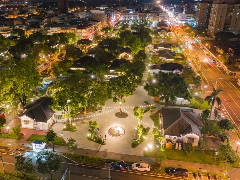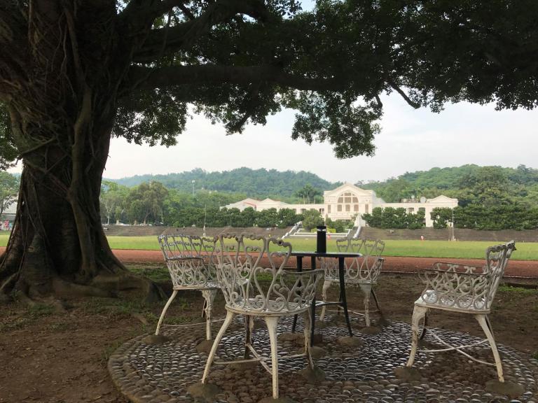 ▲中興新村大操場老樹與中興會堂。(圖/記…