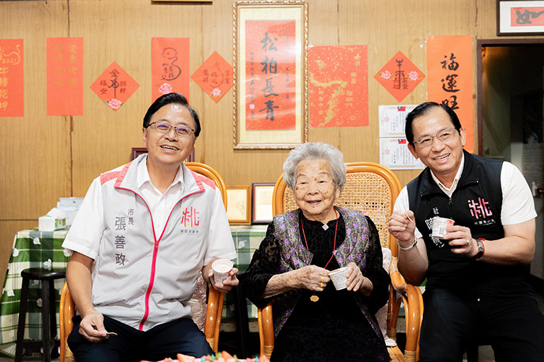 ▲訪視百歲人瑞陳吳阿絨女士,張市長致贈重…