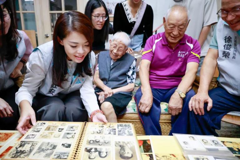 ▲市長高虹安和楊金蓮奶奶聊家常看舊照片。…