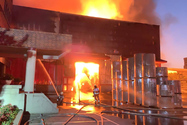 ▲觀音區一家紙業公司發生大火,火焰從工廠…