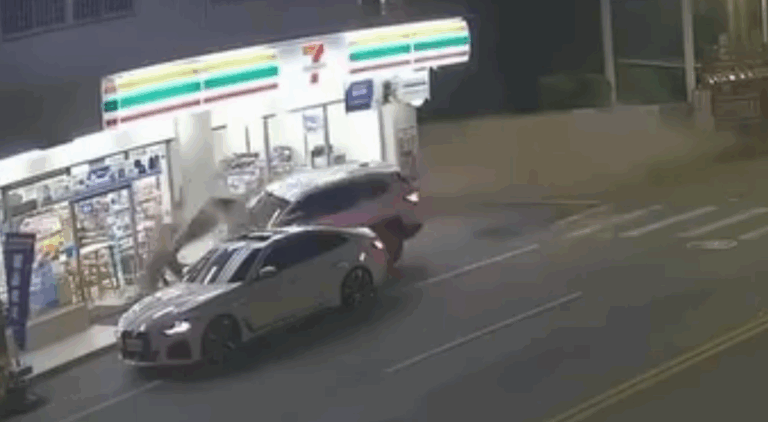 休旅車失控衝撞路邊超商。翻攝畫面 …