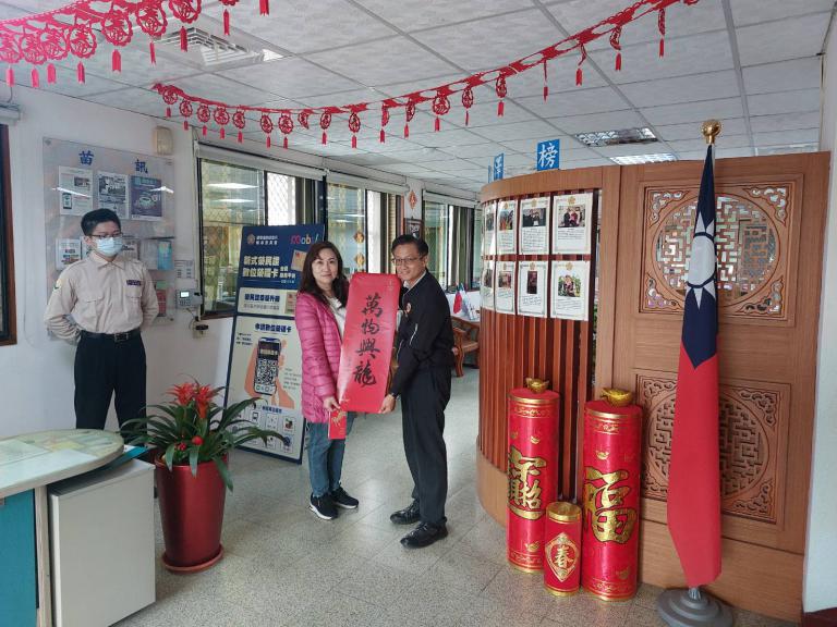 ▲總幹事林育文(右)致贈洽公榮眷總統府春聯…