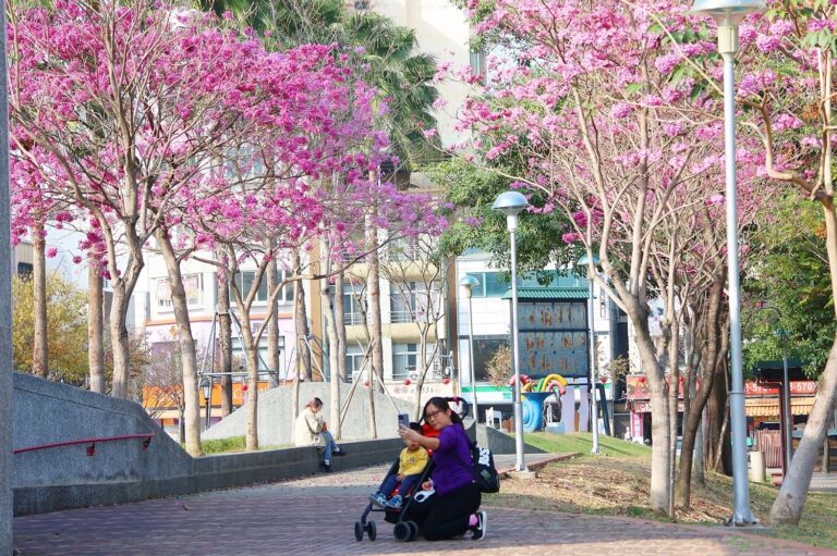 嘉義公園裡的洋紅風鈴木盛開。(圖/嘉市府…