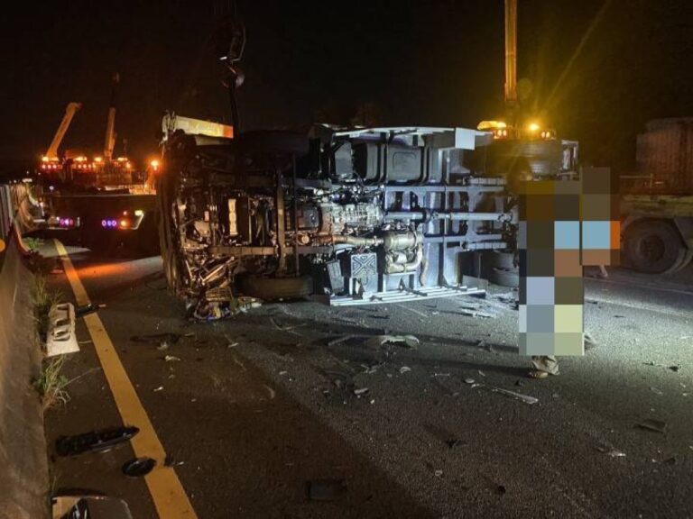 國道1號彰化路段兩輛貨車相撞翻覆,現場一…