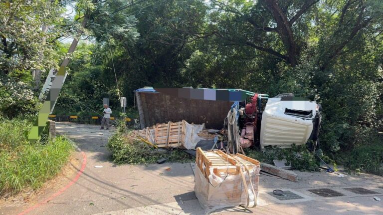 台中沙鹿區大貨車撞電桿側翻。翻攝畫面 …