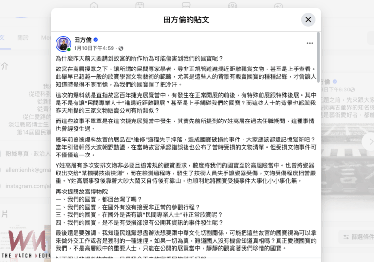 田方倫於日前臉書貼文,指故宮博物院於百…
