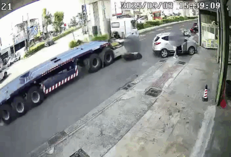 ▲差點奪命!78歲女騎士閃違停車 與曳引車…