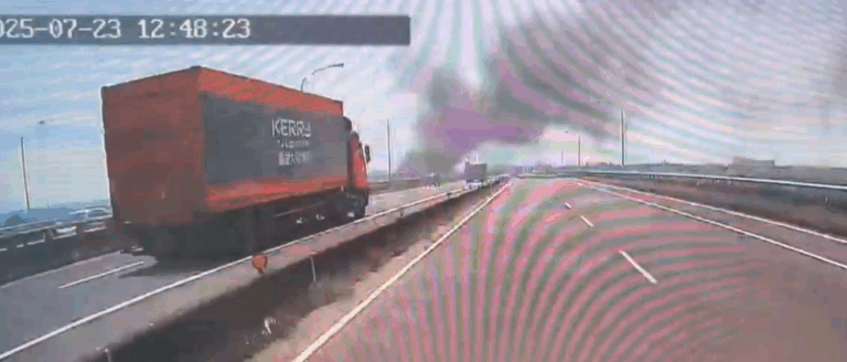 屏東萬大橋上小貨車起火冒出濃煙。翻攝…