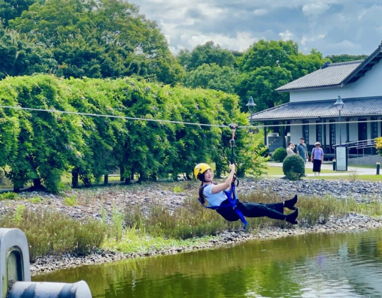 滑索設施全長85公尺,橫跨園區中央湖面,…