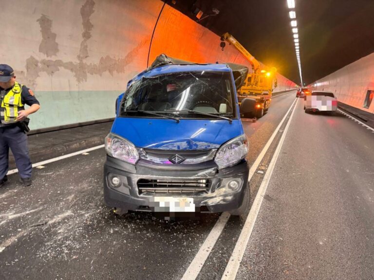 國道5號雪山隧道內小貨車爆胎自撞。翻攝畫…