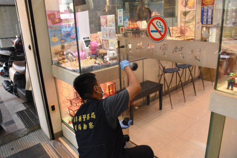 竹南發生銀樓搶案,員警前往鑑識。翻攝畫…