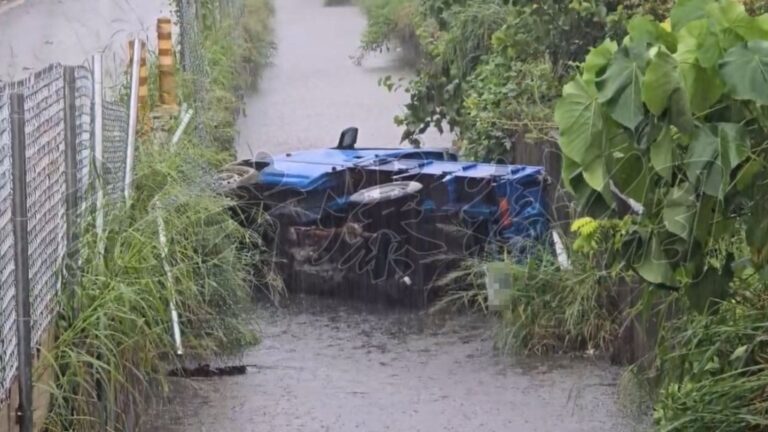 ▲小貨車疑為閃避樹枝,連人帶車摔進一旁溝…