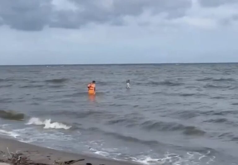 海巡隊員救援走進海中的女子。翻攝畫面 …