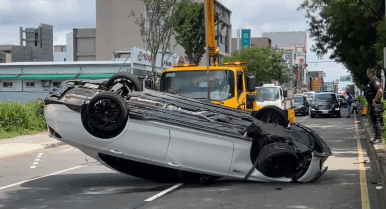 台中市中清路白色賓士車駕自撞分隔島翻覆…