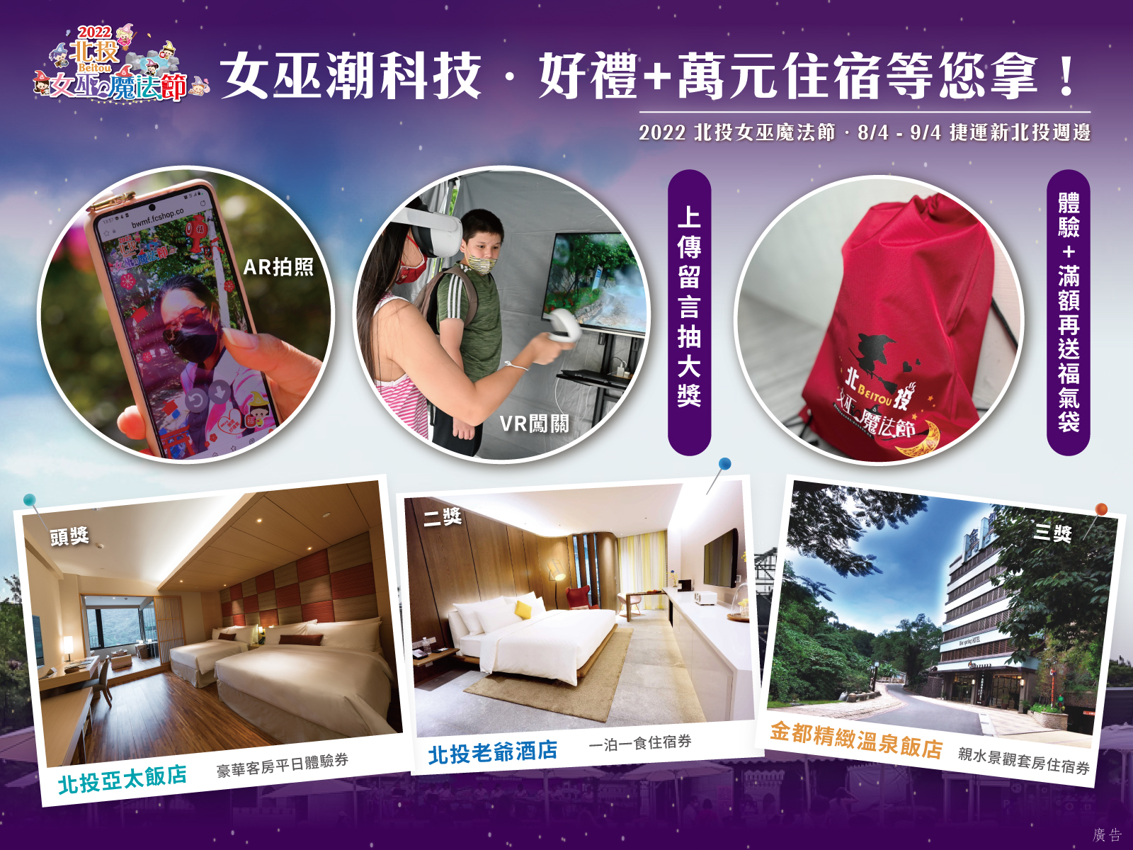 「2022北投女巫魔法節」結合時下最流行的AR(擴增實境)打造互動遊戲!民眾只要拿起手機於北投公園魔光幻境內,找到任一個AR虛擬女巫合影(共6款),截圖上傳「台北市溫泉發展協會粉絲團」活動期間的置頂貼文,並tag#北投女巫魔法節,就有機會抽中精美獎品,如定價萬元以上的北投亞太飯店豪華客房體驗券、北投老爺酒店一泊一食住宿券、金都精緻溫泉飯店親水景觀套房住宿券……等共12項免費優質溫泉會館住宿券獎項;還有日勝生加賀屋國際溫泉飯店春夏雙人湯屋券、三二行館大眾湯券、北投水都溫泉會館客房泡湯劵……等100項湯券獎項,以及北投水美溫泉會館小家宴(四人餐)餐券……等總計超過百樣獎品,總價值超過新臺幣二十萬,十分豐富!