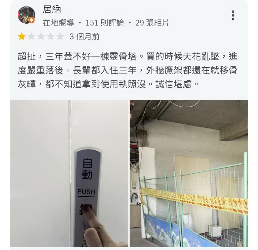 自有民眾檢舉違反水土保持法,縣府均有進行行政查察並依法開罰至今超過80餘萬元,並於114年5月裁定違章建築在案。至於「富貴天境」墓園塔位哪一年開始營業?今年初署名「居納」網友透過網上貼文抱怨,三年蓋不好靈骨塔,「長輩都入住三年,外牆鷹架都還在就移骨灰罈,都不知道拿到使用執照沒。誠信堪慮」。至於「富貴天境」墓園塔位是否已取得合法營業執照?在業者諱莫如深拒絕出示的情況下,外界仍不得而知。