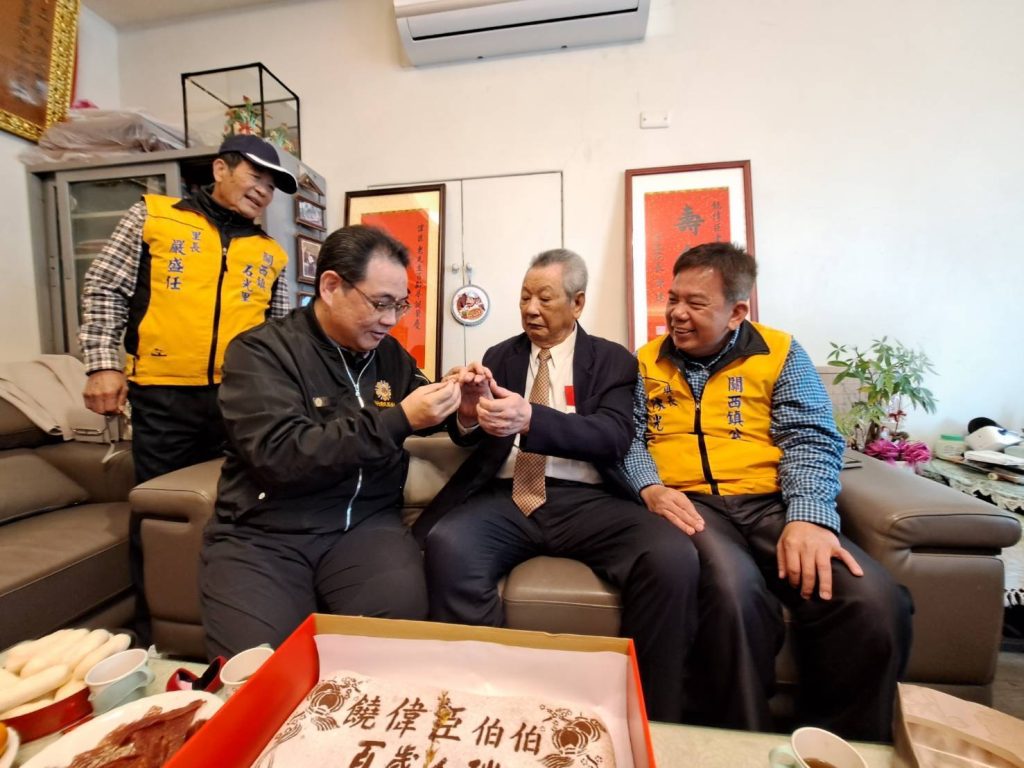 新竹榮民服務處鞠宗顯處長近日偕同羅仕琦議員、關西鎮長陳光彩、石光里嚴盛任里長、榮欣志工等,一起為百歲人瑞爺爺饒偉臣,歡喜慶生祝賀「福如東海,壽比南山」。