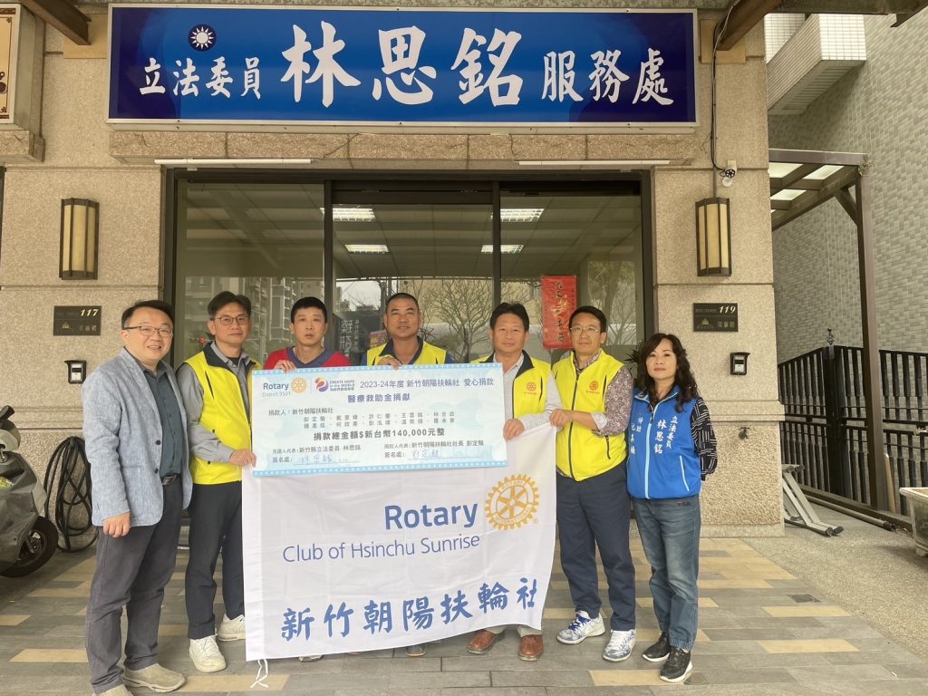 昨日(22日),在竹北服務處,立法委員林思銘携手服務團隊見證了朝陽扶輪社舉行的一場感人捐贈儀式。這場儀式的目的是為了幫助正在與病魔奮戰的王姿云小朋友及其家屬,透過彭定駿社長及戴里煒、許仁豪、王雲銘、林合政、鍾進炫、彭泓瑋、溫紫翎、羅承章等善心人士等的共同努力,募集了14萬元的醫療救助金,希望能夠渡過她們的醫療難關,特別是王小朋友目前正因心衰竭而面臨著巨大的挑戰。