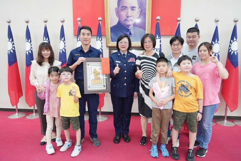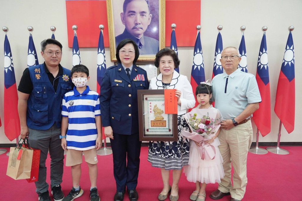 新竹縣113年警察模範母親出爐,刑事警察大隊偵查佐王嘉宏母親王陳月祝女士,新埔分局警員張哲豪母親蔡碧雲女士,分別獲選模範母親,局長宣介慈特於母親節前夕,頒贈精美獎座與禮券送上祝福,肯定其奉獻。