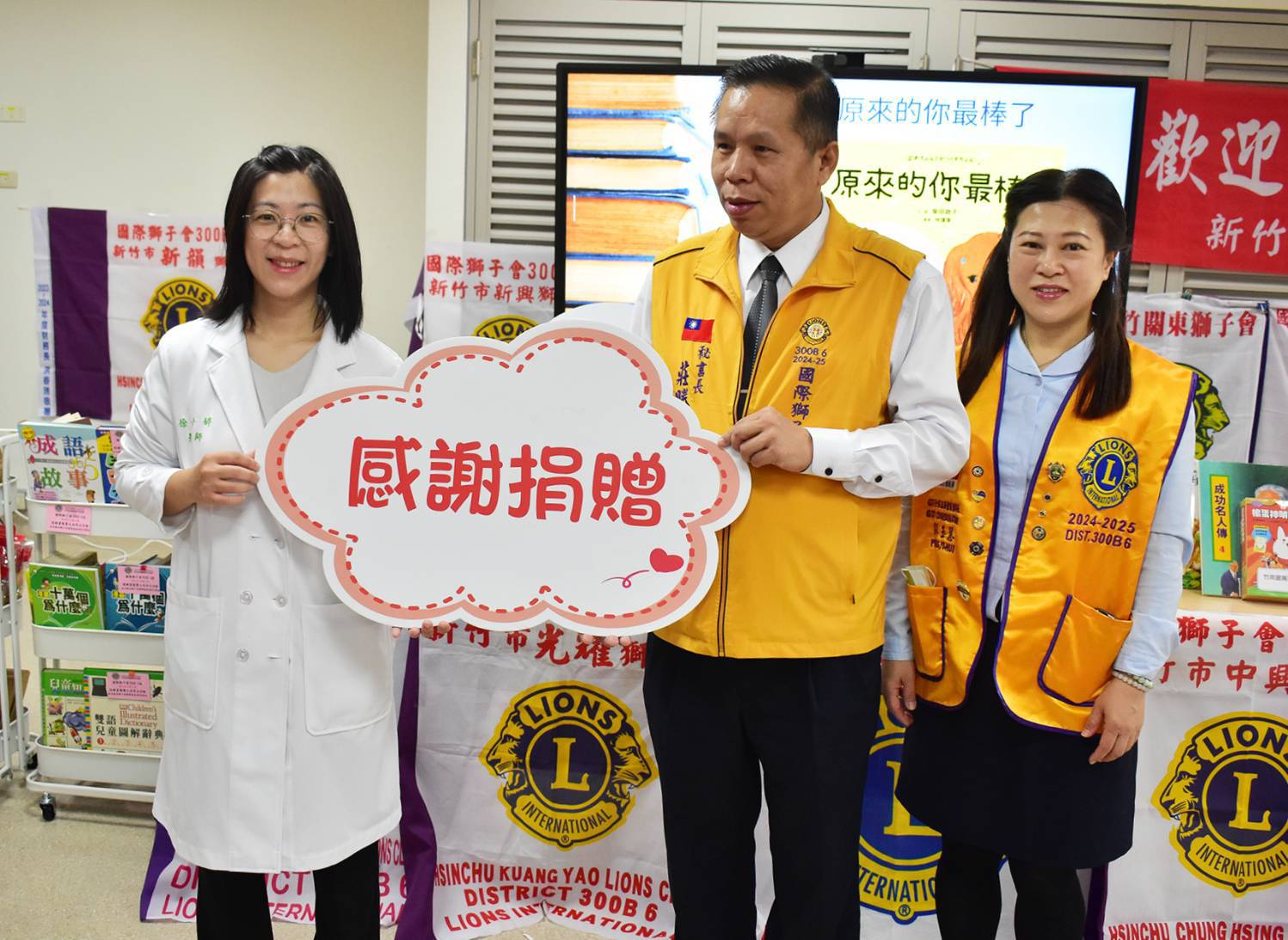 新竹台大分院竹北院區洋溢書香與歡笑,關懷兒童醫療說故事活動溫馨展開,獅子會竹南區、新竹區多個分會,攜手捐贈精選兒童書籍及4部行動推車,以及畫畫板、文具用品等貼心小禮物,為孩童們帶來充滿想像力與溫暖的閱讀饗宴。小兒部徐千婷醫師表示,閱讀對孩童來說是一扇通往世界的窗,推動親子共讀及書籍陪伴,可幫助在醫療過程中轉移注意力,紓解緊張情緒,感受家人間的溫暖與支持。感謝獅子會的慷慨捐贈,讓兒科病房擁有更豐富的閱讀資源,陪伴孩子開啟更多奇妙的探索旅程。
