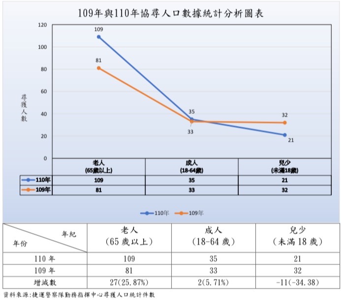 根據捷警隊統計,捷運系統受(處)理走失者今年1至12月20日止共165人,較去(109)年146人,增加19人,且以65歲以上長者增加26%最多。捷警隊呼籲,伴隨家中有身心不便或年長者之家屬出門,應隨時留意其狀況,如發現有任何問題應盡快就醫,並盡量避免單獨外出,如仍須外出請由家屬陪同或於身上配戴可辨識或聯繫之資料或手鍊;捷警隊除戮力維護捷運系統安全,更本於同理心為民服務精神,建立「迷途者資料庫」及「line群組」,以利接獲報案能即時迅速為迷途者找到回家的路或為焦急家屬尋回親人。