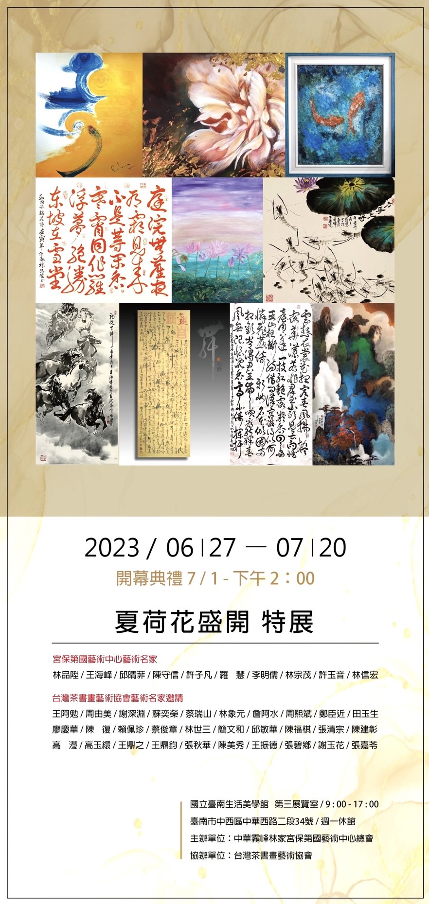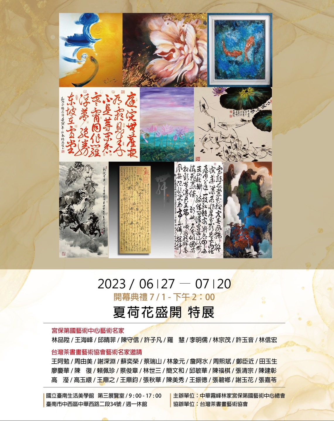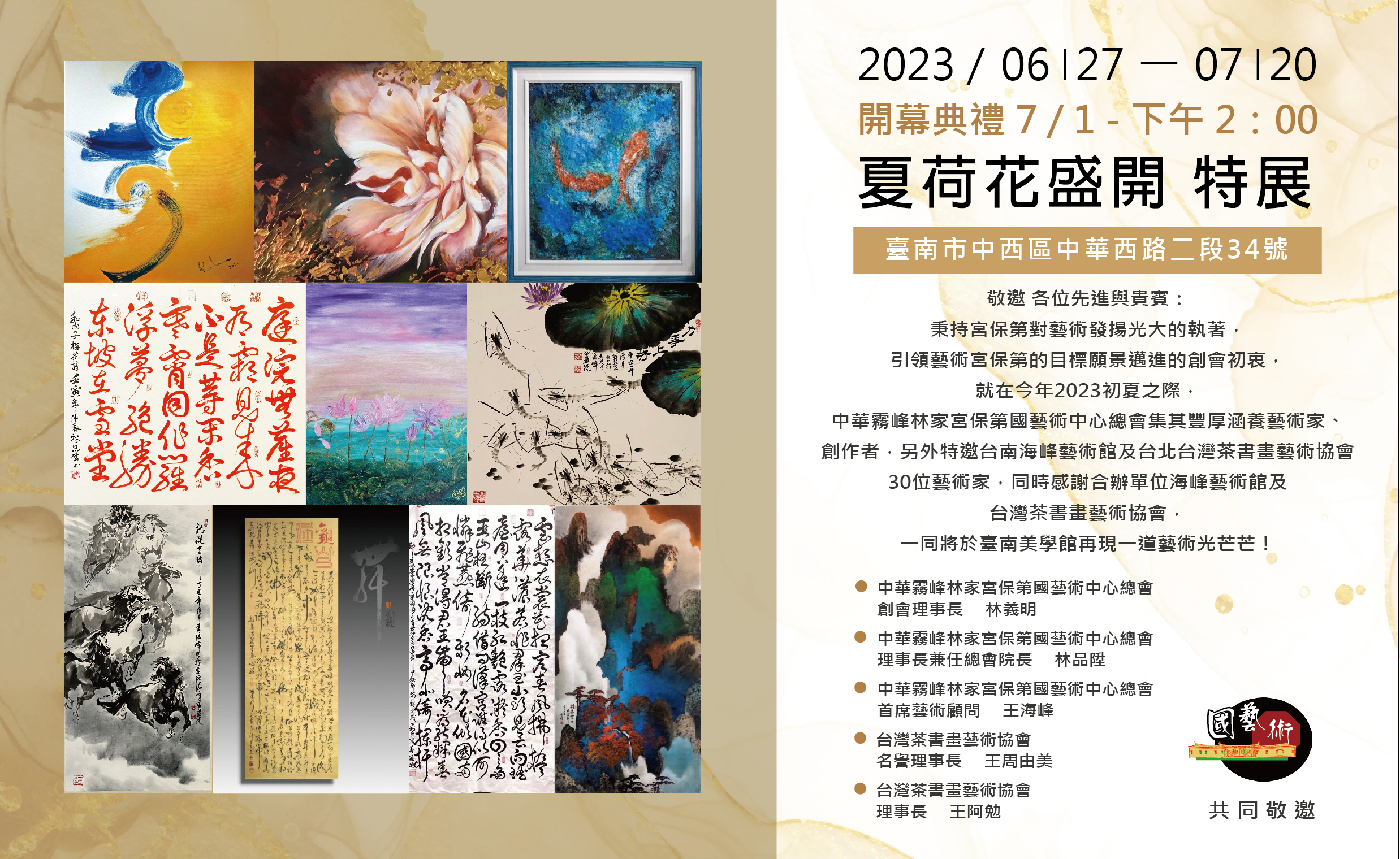 中華霧峰林家宮保第國藝術中心總會(LNAA)特邀總會10名資深優秀藝術名家們,於2023年6月27日起為期一個月在國立臺南生活美學館(第三展覽室)舉辦新創藝術聯展,參展藝術名家的作品很多都是難得的作品,作品涵蓋水墨畫、油畫、膠彩畫、書法作品,值得前往欣賞及收藏,歡迎大家一起來看展。